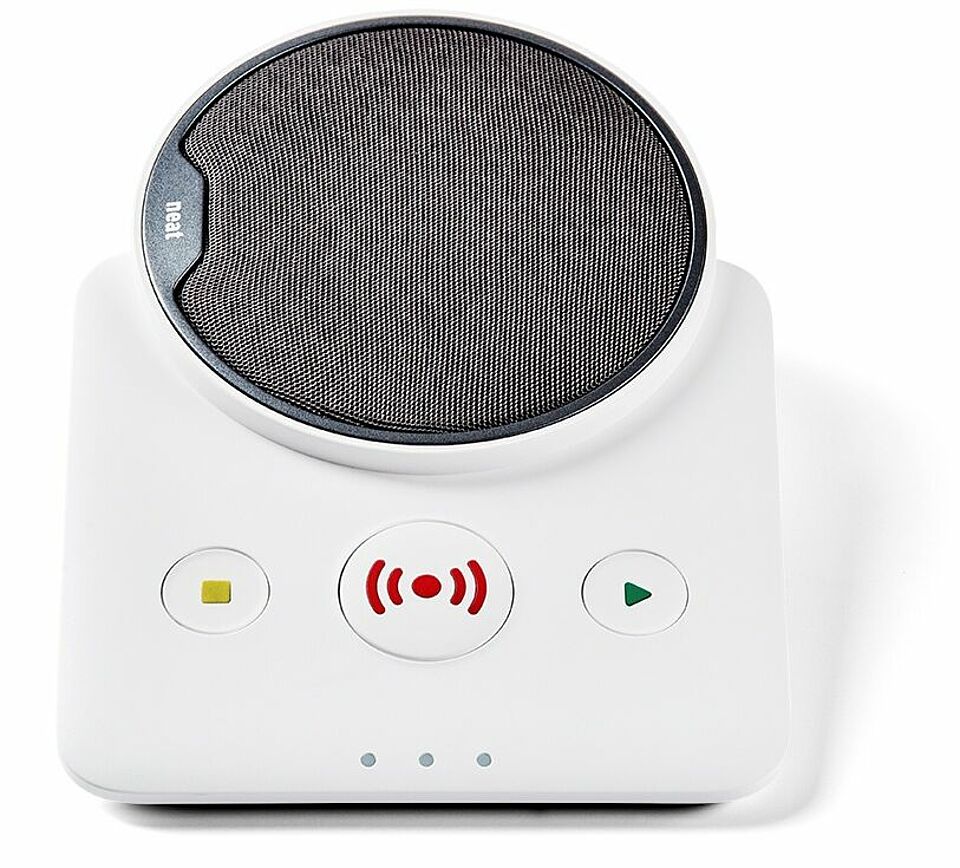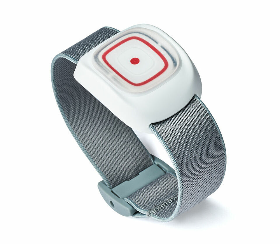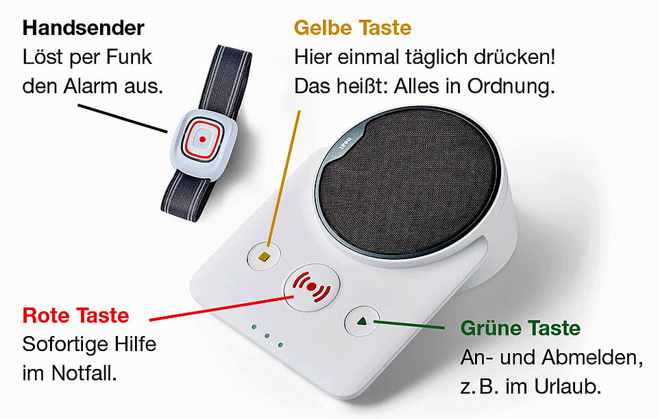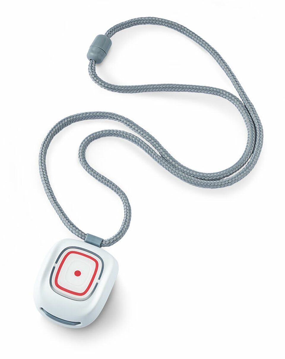 Mit Funkhandsender Smile zur Alarmauslösung, tragbar am Arm oder um den Hals.