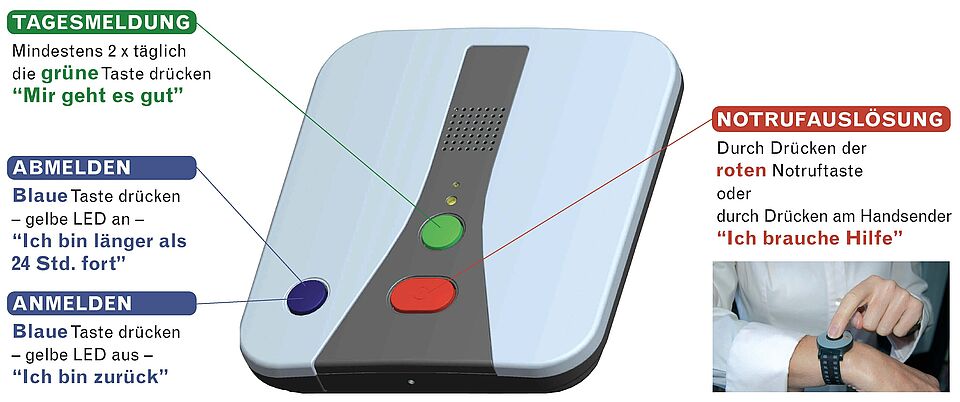 Kurzbeschreibung: Hausnotrufsystem als Zusatzgerät für das vorhandene Telefon zum Anschluss an die analoge Telefonleitung.